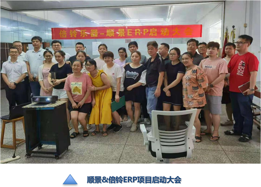 2021年8月11日举行惠阳倍铃乐器配件有限公司顺景ERP系统启动大会,倍铃董事长鲁董、项目经理储耀庭、各部门主管和业务骨干参与了本次启动大会,顺景公司副总李江谋、项目经理覃君毅、助理顾问黄杰进行了实施规划、实施方法及注意事项等进行了汇报。
